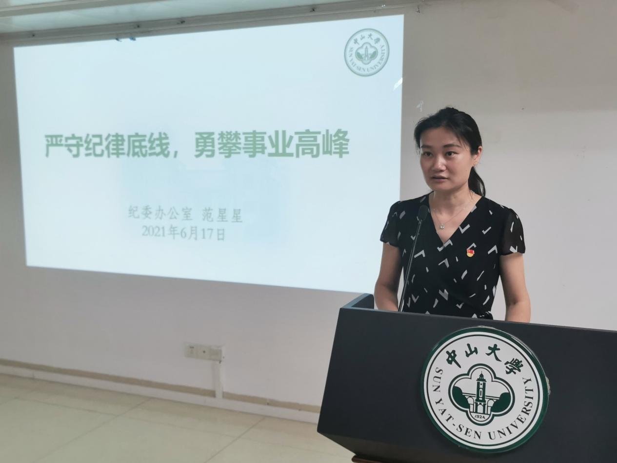 范星星同志从党史中的纪律讲起,回顾了我们党百年峥嵘岁月中严守纪律的经典故事,分享了历代领导人关于加强党的纪律建设的重要论述,阐释了纪律严明是我们党的重要优势。同时结合高校领域违规违纪典型案例剖析表明纪律是组织和个人事业发展的生命线,提醒老师们要进一步强化纪律意识和规矩意识,严守底线,不越红线。