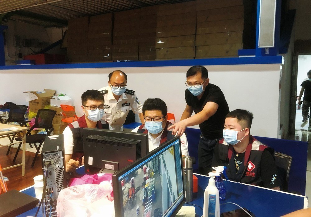 秦鹏哲(后排右一)与公安联合排查监控视频