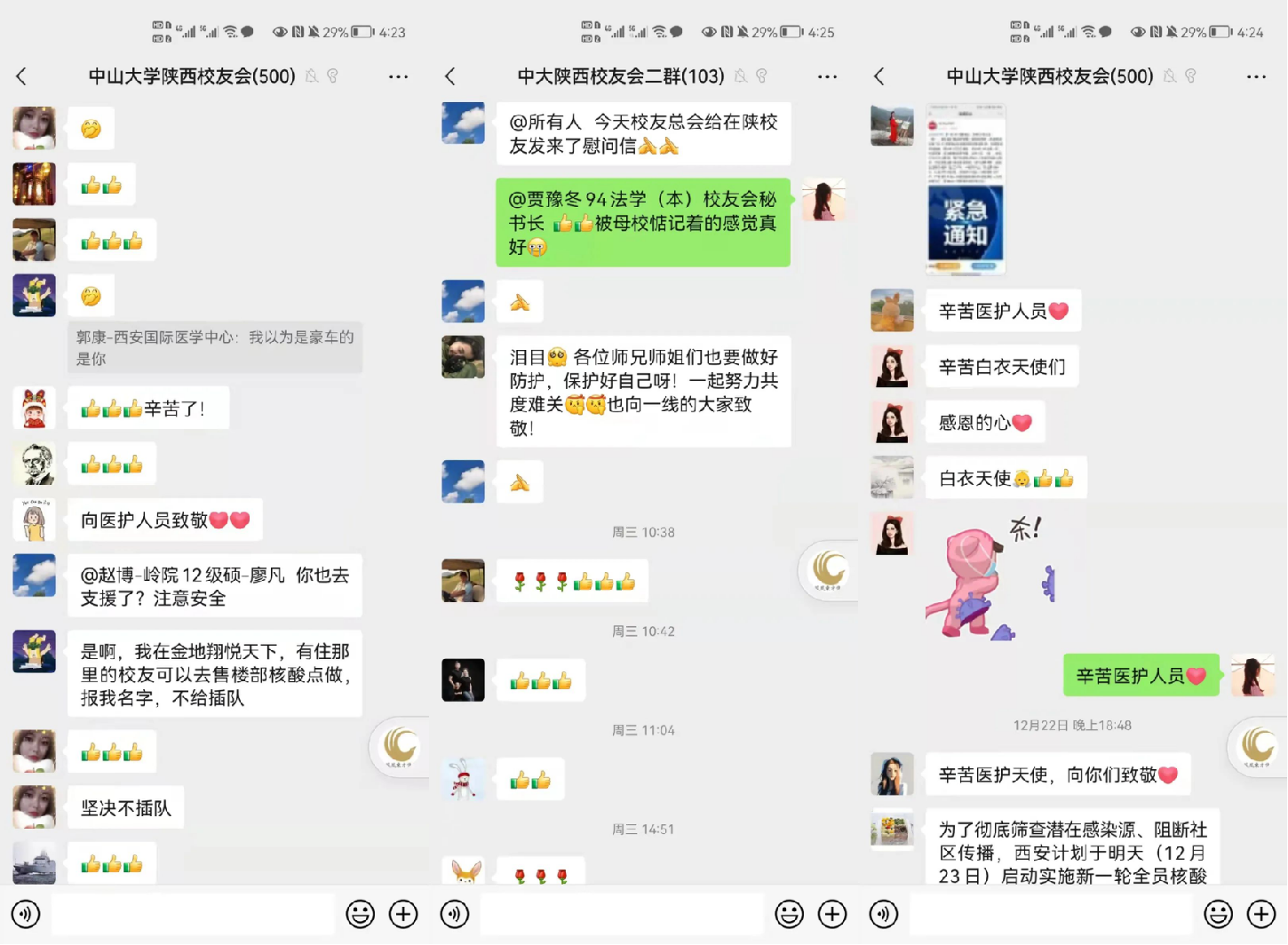 在中大陕西校友群中,看到了很多小伙伴奋战在一线的场景,也有一些校友是志愿加入服务队伍。这些在抗疫一线最勇敢无私的身影都值得被看见、被欣赏、被支持。