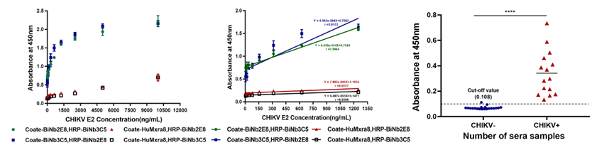 与传统抗体相比,纳米抗体具有结构稳定、亲和力高、不易聚集、可识别潜在抗原表位、易于人源化等优点,常被用作结构生物学、细胞生物学和发育生物学等研究工具。通过三轮生物学淘选,成功筛选出20株特异性纳米抗体。其中,对纳米抗体Nb-2E8和Nb-3C5进行串联改造,发现其在纳摩尔范围内与E2蛋白特异性高亲和力结合。结果表明,与单价抗体相比,多价纳米抗体Nb-2E8和Nb-3C5显示出高亲和力。与单价形式相比,亲和力提高100倍以上,表明可以应用于检测血清中的CHIKV病毒颗粒,并为疾病诊断、药物治疗和疫苗研发等提供帮助。