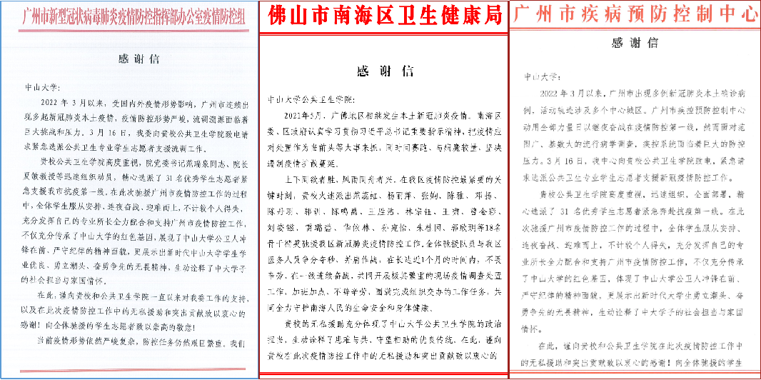 2022年3月-5月,学院团委发扬积极抗疫、守护人民健康的优良传统,再次组织抗疫志愿队135人次支援广州市疾控及其下属的白云区疾控、黄埔区疾控、天河区疾控、花都区疾控及各流调中心,践行公卫人的使命担当,得到广州市疾控领导和同志们的一致好评。疾控部门对公卫学子发挥专业优势,为抗疫贡献力量的精神表示高度赞扬与肯定,纷纷向学院发来感谢信,相关事迹在广州日报、羊城晚报等多家媒体报道。