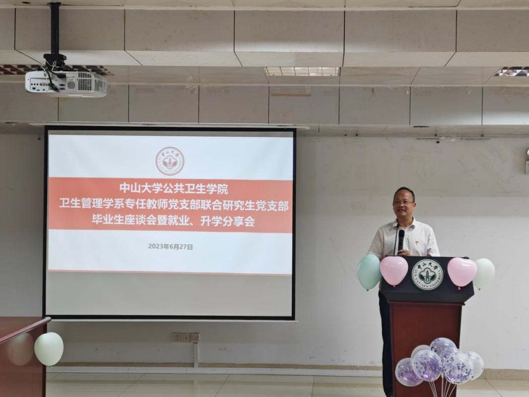 为扎实推进学习贯彻习近平新时代中国特色社会主义思想主题教育工作,聚焦医药卫生健康治理,培养管医文综合融通、具有国际视野的公共管理专门人才,进一步了解毕业生动态,上好毕业生在校最后一课,扣好入职第一粒扣子,提高育人实效,6月27日下午,卫生管理学系专任教师党支部联合研究生党支部在公卫楼侧三会议室举行“理想信念薪火传,同心筑梦谱新篇”2023届毕业生座谈会主题党日活动。本次活动主题聚焦“研究生培养”,坚持以学生成长为中心,推进卓越研究生培养,提升高层次创新型人才自主培养质量,特别邀请党委书记范瑞泉同志、陈少贤教授莅临座谈会,教师代表、毕业生代表和卫管系全体在读研究生参加会议,卫管系专任教师党支部副书记杨廉平副教授主持座谈会。