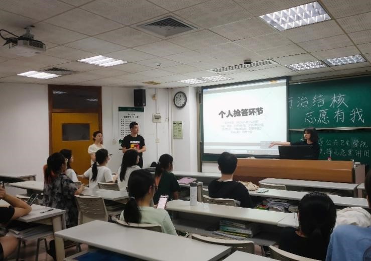 第二个环节——组内个人抢答。参赛者按照抽签的随机分组,在组内进行个人举手抢答,题目类型包括单选、多选、判断、填空等多种形式。参赛者热情高涨,比赛过程紧张而又激烈,一道道题目不断出现,又被不断解决。在这个过程中,同学们的防治结核知识素养体现得淋漓尽致。