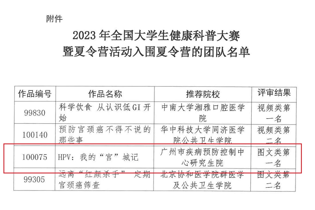 由William希尔-广州市疾病预防控制中心高水平公共卫生人才培养示范基地广州市疾病预防控制中心研究生院选派,我院2022级公共卫生专业硕士研究生苏洁雯同学(“医防管”三栖人才实验班学员)参与的《HPV:我的“宫”城记》经过网络投票、专家评审,获得图文类第一名的好成绩并入围夏令营活动团队名单。据悉,苏洁雯与团队另两位同学一起将于8月6日至9日前往云南省昆明市和瑞丽市参加夏令营,在当地参观红色教育基地和科普基地,以及结合本次健康科普大赛的主题对少数民族地区的科普工作进行调研。