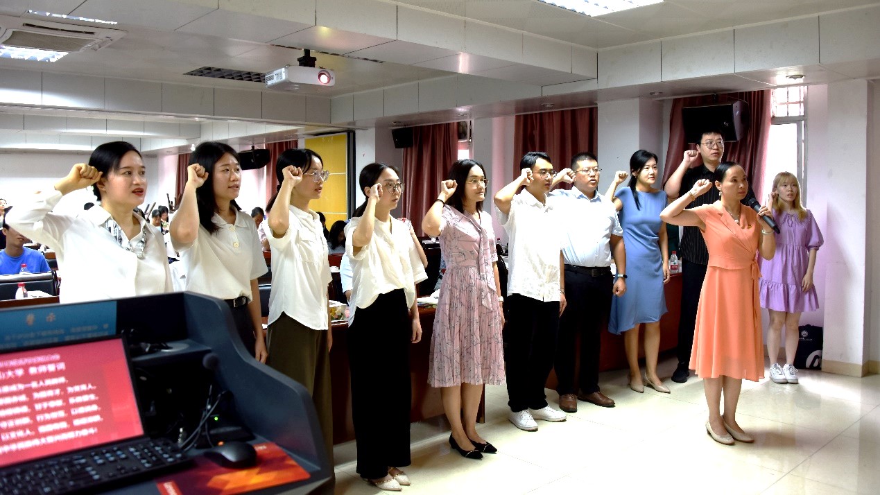 学院党委副书记王燕芳作为领誓人带领我院今年新入职的10位教职工进行宣誓,希望各位新老师牢记“入职誓言”,为党育人、为国育才。10位新教师宣誓的铮铮誓言也让我们感受到了新教师的初心和勇担使命的决心。随后,范瑞泉书记为新教师们授学院院徽及鲜花,以最热烈的方式欢迎这一群新生力量的加入!