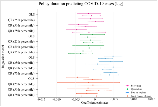本研究通过收集全球185个国家和地区2020和2021年的边境政策,入境人数及新冠传播数据,使用分位数回归模型并校正社会,人口和经济因素,旨在探索各国四个等级边境政策的累计持续时间与累计感染数的关联,以及该关联在不同传播严重程度国家间的异质性。结果显示(图1),对于中,高传播严重程度的国家,“禁止高风险国家人员入境”的政策由于无法从总入境人数上加以控制,长期维持该措施对于本土疫情的抑制作用有限,同时可能带来潜在的歧视和不平等性。多项敏感性分析结果验证了上述结论的稳健性。本研究为未来全球边境政策制定和优化以应对新冠及其他新发传染病的流行提供依据。