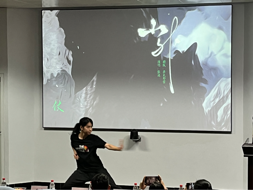 武术表演《山外》中,刘思语同学身姿飒爽、动作行云流水、脚步稳健潇洒,引得老师同学们称赞不绝。静若伏虎,动若飞龙,缓若游云,疾若闪电的剑舞表演让大家对武术多了几分崇敬与热情。