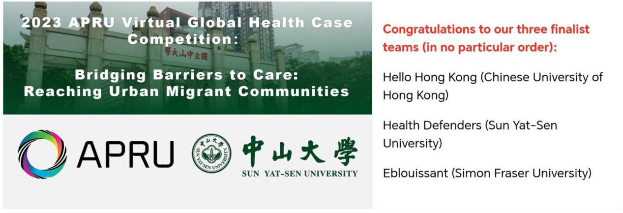 环太平洋大学联盟全球健康学生案例大赛(2023 APRU Virtual Global Health Case Competition)是由环太平洋大学联盟主办的一项国际性的虚拟案例大赛,鼓励全球各地的学生锻炼批判性思维和解决问题的能力,以帮助解决全球性的挑战性问题。