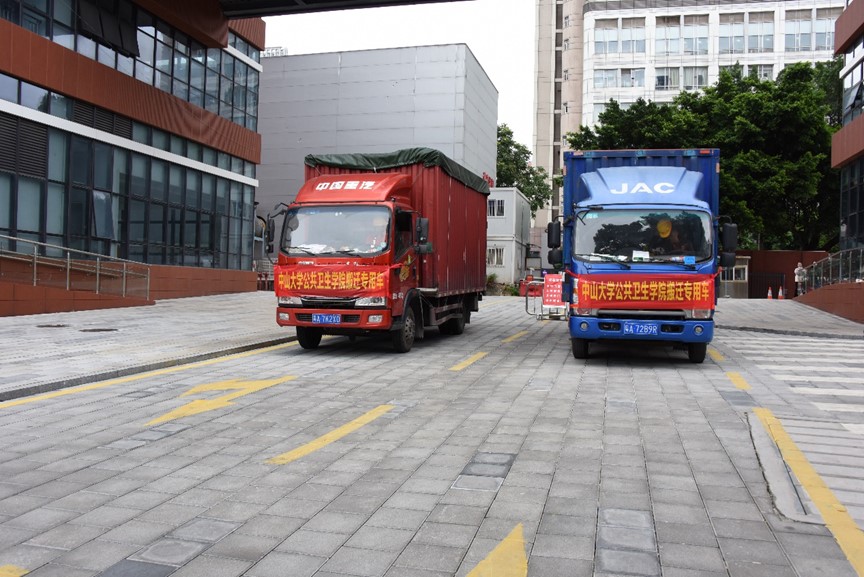 随后,参会人员在医学3号楼前合影留念,共同见证学院发展历史中的重要时刻;身披条幅的搬迁车队在一片欢送声中满载着学院发展的新希望出发!