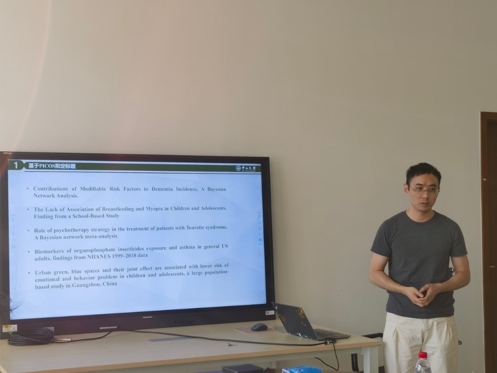 第二位分享嘉宾是梁景宏师兄,他向同学们介绍了循证金字塔和PICOS原则以及如何基于前两者进行选题。梁师兄首先分析了不同类型研究的PICOS标题的异同,展示如何基于PICOS拟定标题,并且介绍了选题的重要性、争议性、创新型、可行性、科学性和常见的三大观察性研究的主题类型。最后,他就选题步骤给出自己的总结性看法:首先要找准感兴趣的变量,定位关键变量,还原数据库,其次确定PICOS原则,然后阅读先前已发表的文献,关注已发表的同样或相似主题以及类似主题有哪些领域空白,在评估主题框架下数据库的可行性后,最后分析数据、撰写文章。