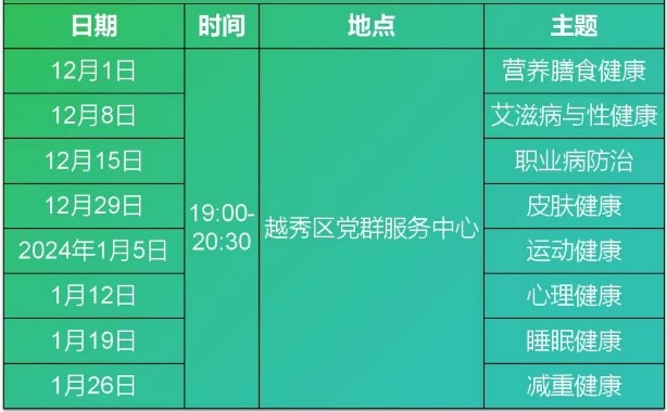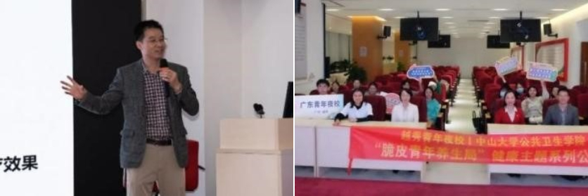 与团越秀区委合作,我们在越秀区党群服务中心开设了青年夜校之“脆皮青年养生局”健康主题系列公开课,2023年12月1日晚7时,williamhill中国王冬亮教授首次开讲,为大家带来“营养膳食健康”精彩讲座。后续每周五晚研究生主讲的养生课程陆续“上架”中,涉及呼吸道疾病预防、皮肤健康、心理健康、运动健康及职业病防治等,让我们一起在夜校找到适合自己的养生之道,从“脆皮青年”蜕变为“活力青年”!