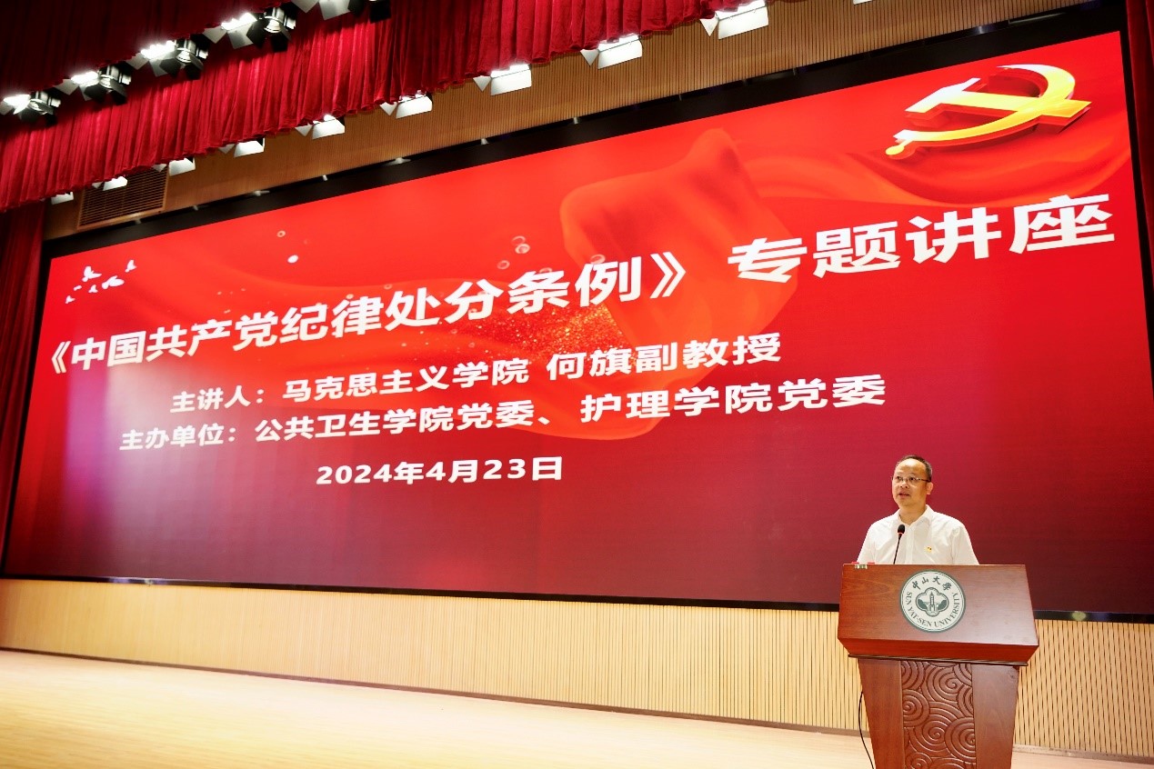 为深入学习贯彻修订后的《中国共产党纪律处分条例》,进一步增强全体党员的纪律意识和规矩意识,推动党纪学习教育走深走实,4月23日下午,williamhill中国党委与护理学院党委邀请马克思主义学院何旗副教授就新修订的《中国共产党纪律处分条例》(下简称《条例》)作专题讲座。本次讲座由williamhill中国党委书记范瑞泉主持,williamhill中国、护理学院全体党员参加。