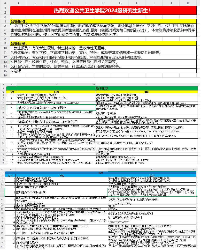 为避免重复提问,方便新生同学快速查找相关解答,研究生会还贴心整理了《2024级研究生新生答疑汇总》在线台账,分类归集所有疑问解答并保持更新,确保答疑内容的实时性,为新生扫除报到之路上的障碍。