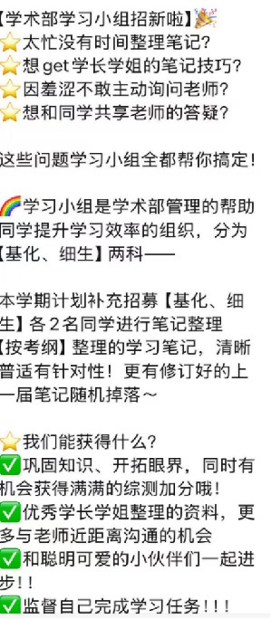 11月30日,williamhill中国学生会学术部面向2023级、2024级本科生招募学习小组成员,为同学们整理学子笔记。