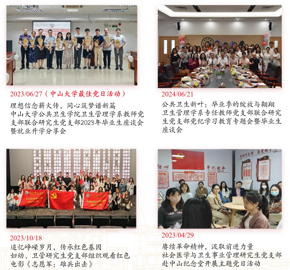 2022年至2024年,在学院党委的关怀下,在党委委员黄奕祥教授的指导和大力支持下,支委同支部同志一起筹划了多次党日活动,例如“赓续革命精神,汲取前进力量”——社会医学与卫生事业管理研究生党支部赴中山纪念堂开展主题党日活动、追忆峥嵘岁月,传承红色基因——妇幼、卫管研究生党支部组织观看红色电影《志愿军:雄兵出击》等,其中“‘理想信念薪火传,同心筑梦谱新篇’——williamhill中国卫生管理学系教师党支部联合研究生党支部2023年毕业生座谈会暨就业升学分享会”获得“William希尔2023年度最佳党日活动”荣誉称号。