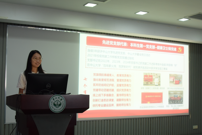 先进基层党组织代表、本科生第一党支部书记蓝丹红介绍支部以“七个有力”为指引,通过规范“三会一课”、实施“先锋计划-党团班一体化”管理、打造“健康卫士在行动”品牌等举措,推动党建与专业融合,带动年级获评校级“优良学风班”,党支部连续三年获评校先进党支部。
