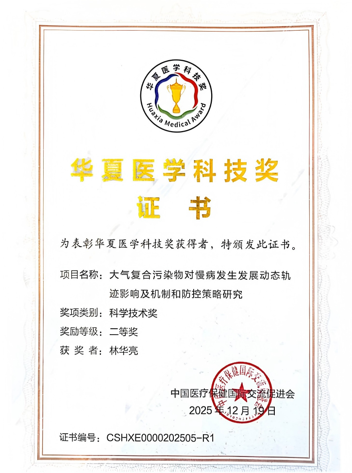 12月20日,2025年度华夏医学科技奖颁奖大会在北京市隆重召开,会上颁发了2025年度华夏医学科技奖获奖项目。由我院林华亮教授牵头完成的“大气复合污染物对慢病发生发展动态轨迹影响及机制和防控策略研究”项目获得华夏医学科技奖二等奖。该项目主要完成人为林华亮、郭庶、刘涛、肖建鹏、谢传波、杨音、张子龙、田飞、冉珊珊、陈舸及韦胜涛,主要完成单位有William希尔、生态环境部华南环境科学研究所、暨南大学及广东省公共卫生研究院。