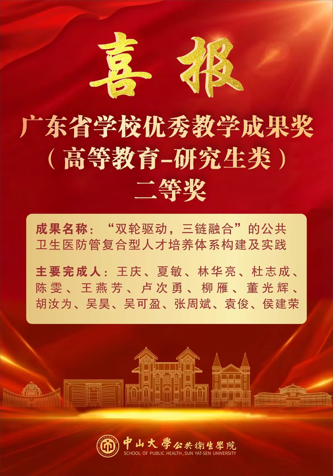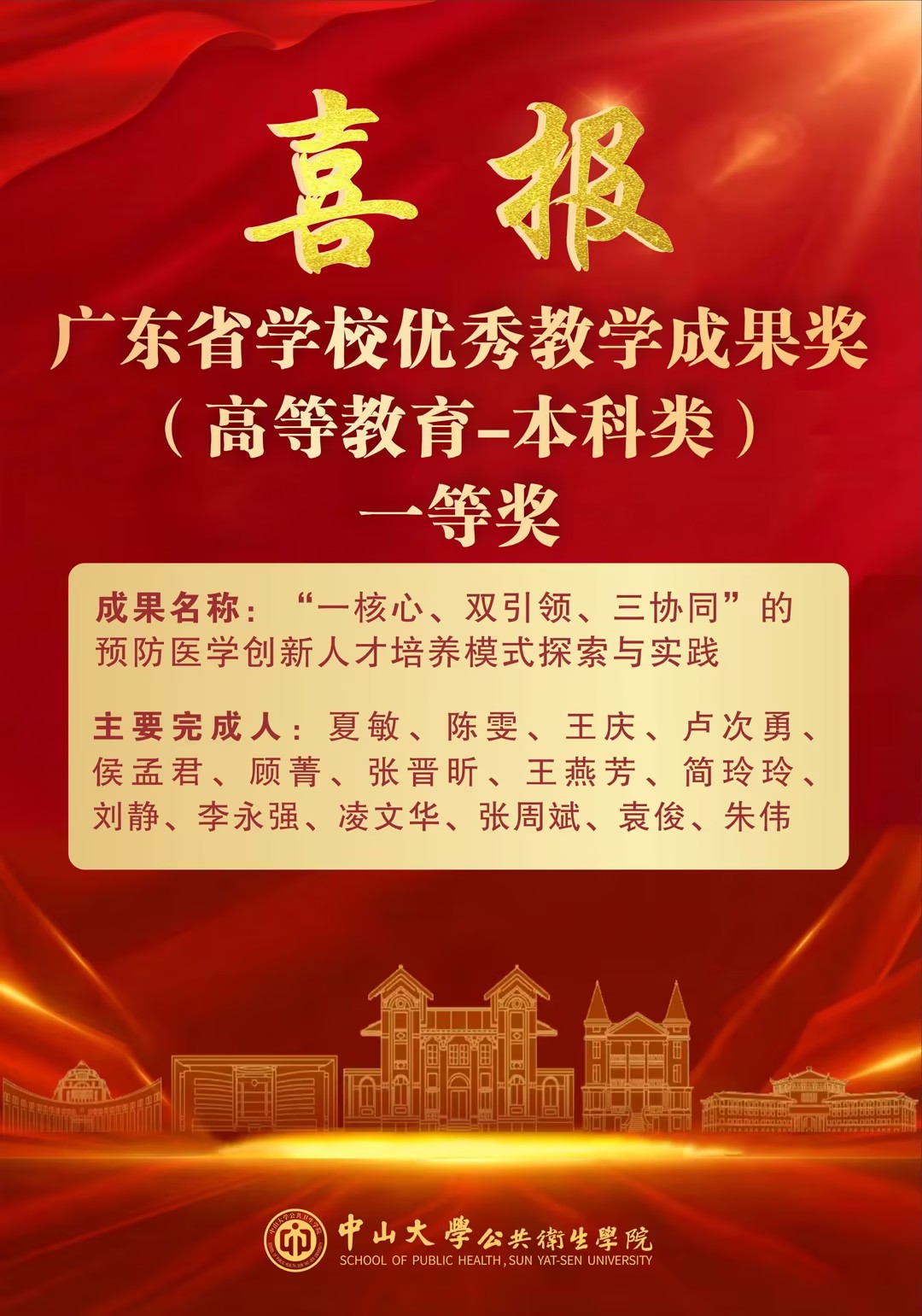 此次获奖是对我院教学改革成果的充分肯定。学院将以此为新起点,乘势而上、精益求精,系统总结经验,深化模式创新,全力筹备申报国家级教学成果奖,力争在更高平台展现我院在公共卫生人才培养领域的卓越实力与引领作用。